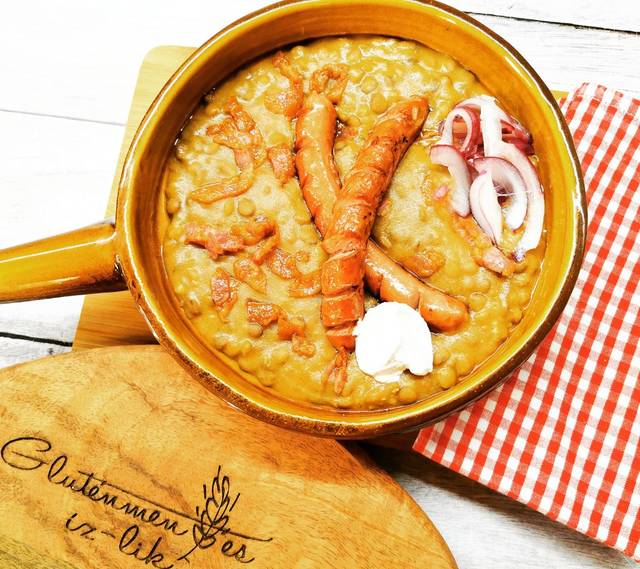 Nagyon ritkán főzök főzeléket, de az év utolsó napján a lencse elengedhetetlen étel az asztalról. Ilyenkor megfőzök egy hatalmas adagot, amiből készül főzelék és saláta. A főzeléket most sült baconnel és virslivel ettük, na meg egy kis lilahagyma salátával.