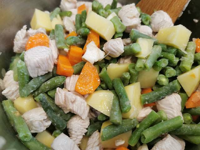 Adjuk hozzá a kockára vágott zöldségeket, zöldbabot