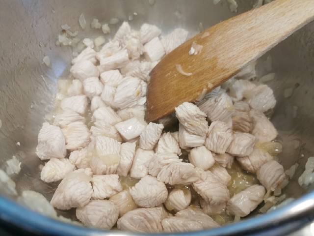 Az apró kockákra vágott hagymát dinszteljük meg a libazsíron, adjuk hozzá a felkockázott húst és pároljuk fehéredésig.