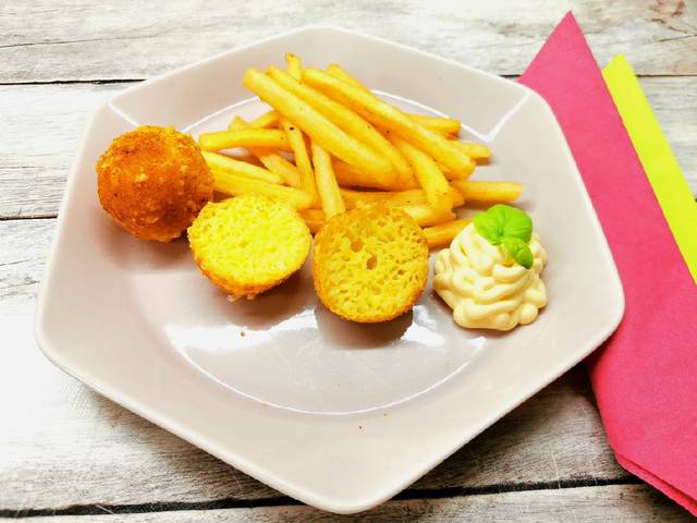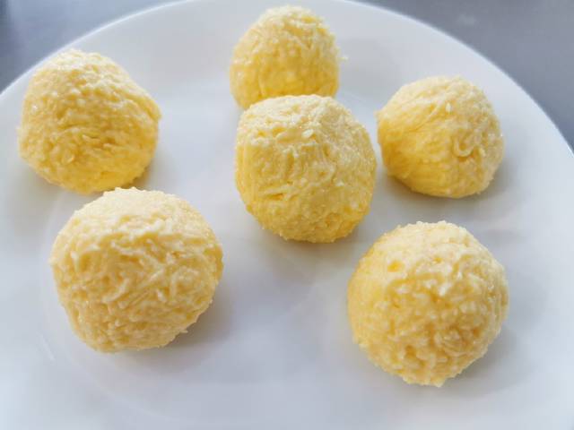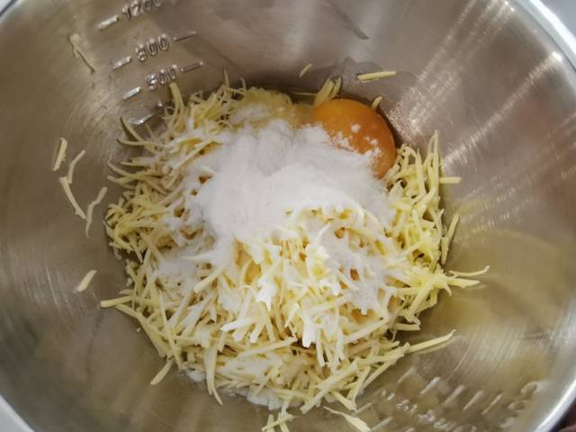 A sajtot lereszeljük, összekeverjük a tojással, liszttel és 6 gombócot formázunk belőle.