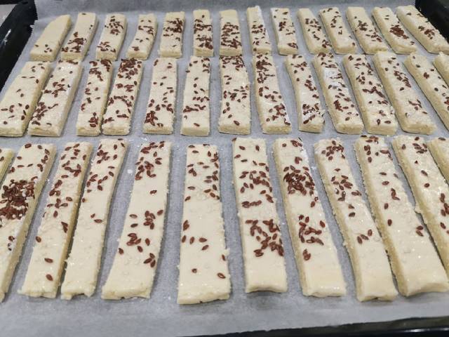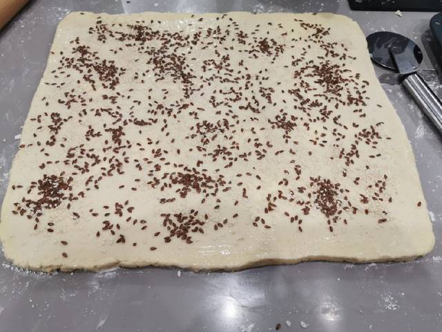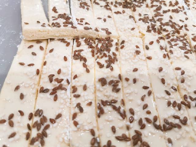 A tetejét lekenjük rizstejszínnel és megszórjuk magokkal, majd vékony csíkokra vágjuk