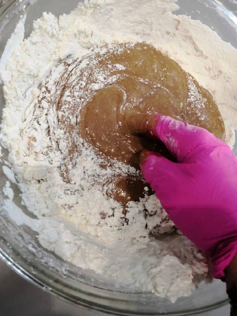 Öntsük a liszt közepébe a meleg mézet, a felvert tojásokat és gyúrjuk össze. Érdemes gumikesztyűben dolgozni, mert nagyon ragacsos a tészta!