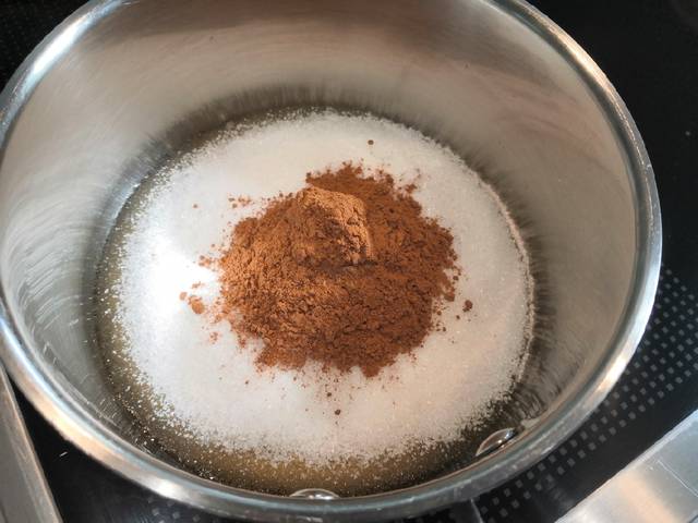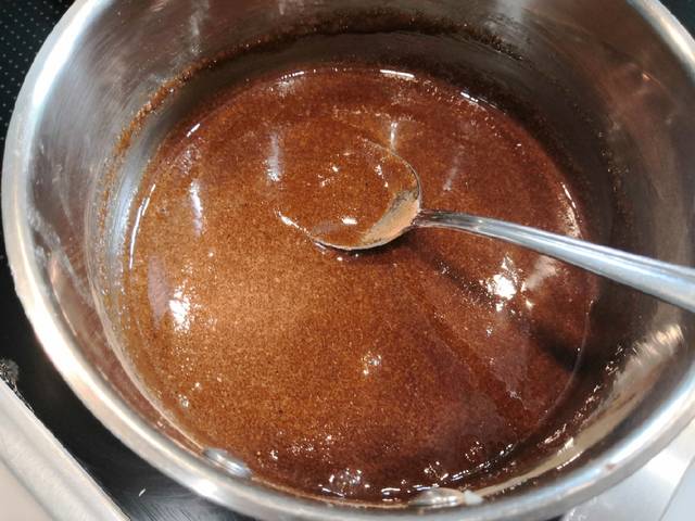 A mézet, a cukrot és a fűszer keveréket összemelegítjük, de ne forraljuk fel!