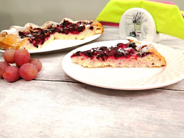Egy kb. 28 cm-es átmérőjű pite formát vékonyan lefújunk étolaj spray-vel, meghintjük rizsliszttel, megszórjuk gyümölccsel.
