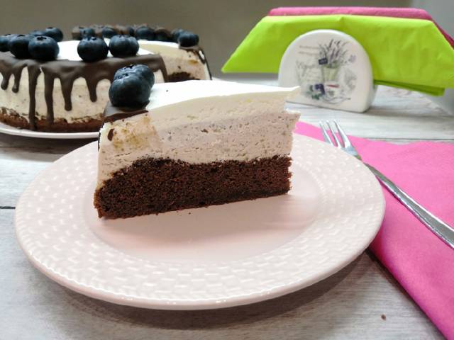 Az étcsokoládét felolvasztjuk gőz fölött, vagy mikróban és belekeverjük az olajat, majd a tortára csurgatjuk, áfonyával díszítjük.