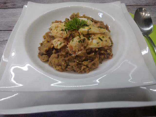 A tojásokat negyedeljük és a pörkölt alaphoz forgatjuk óvatosan. Felforraljuk és már tálalhatjuk is. Mi ma éppen lencsefőzelékkel ettük.