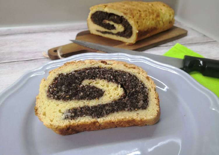 Ebben a kalácsban nem érezzük sem a tejnek, sem a tojásnak, sem a glutén hiányát. Ha vékonyabbra nyújtjuk a tésztát, tökéletesen megállja a helyét a karácsonyi ünnepi asztalon bejgli helyett is. Természetesen mák helyett készíthetjük diós, kakaós töltelékkel is. A tészta annyira egyszerű, hogy gumikesztyűs kézzel is 1-2 perc alatt összeállítható.