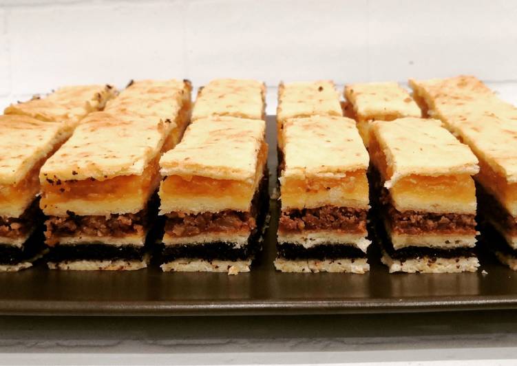 Megkenjük mákos töltelékkel és befedjük egy újabb kinyújtott tésztával.