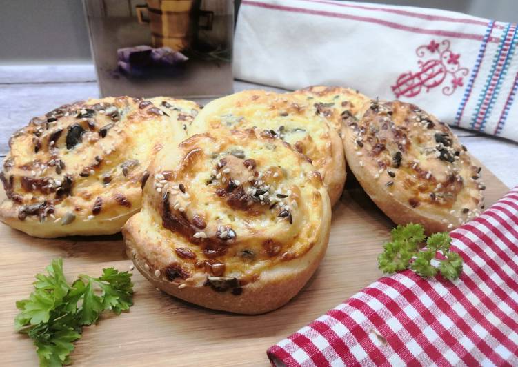 Feltekerjük a tésztát és éles késsel kb. 1,5 cm vastag csigákat vágunk belőle. Sütőpapírral bélelt tepsibe tesszük és 40 percet kelesztjük meleg helyen.