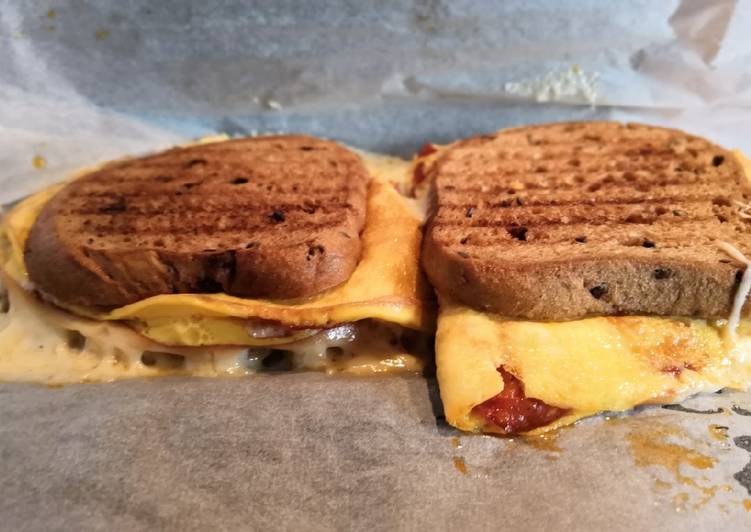 A melegszendvicssütőt felmelegítjük, kibéleljük sütőpapírral és 2 szelet kenyeret teszünk rá. A tojásos alapot félbehajtjuk, elfelezzük, majd a kenyérre tesszük, amire ismét kenyérszeletet helyezünk. A melegszendvics sütőt ráhajtjuk és pár perc alatt ropogósra sütjük.