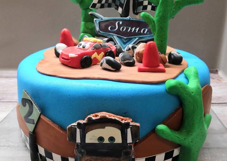 Ezt a tortát a kisfiam 2. szülinapjára készítettem. Belül roppant egyszerű, főzött csokikrémes, nálunk ez a legnagyobb kedvenc. Mivel a totyogóm Villám Mcqueen rajongó, ezért szóba sem jöhetett más mintázat. A burkoláshoz kész fondantot használtam, pár díszítő elem ehető cukorlap. A kaktuszban lévő támasztó drótokat leszámítva, a torta minden része ehető.