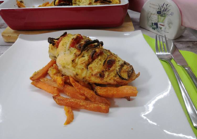 Egy tepsibe tesszük a hasábokra vágott édesburgonyát. A csirkemellet megforgatjuk a fűszeres lisztben, a burgonyára fektetjük.