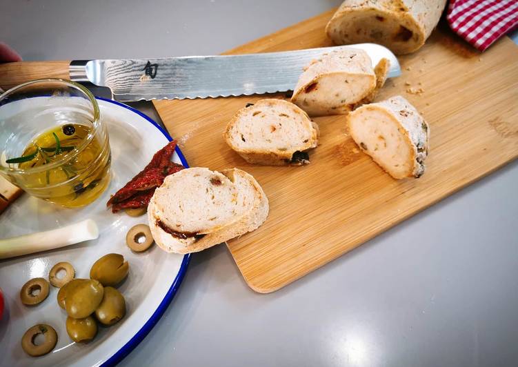 - Aprítsuk fel az olajbogyót, marinált paradicsomot, bazsalikomot. A tészta száraz hozzávalóit tegyük egy tálba, alaposan keverjük össze az apróra vágott hozzávalókkal. Adjuk hozzá a vizet és keverjük össze, amíg egynemű lesz. Ehhez adjunk 2 evőkanál fűszeres olajat és jól gyúrjuk át.