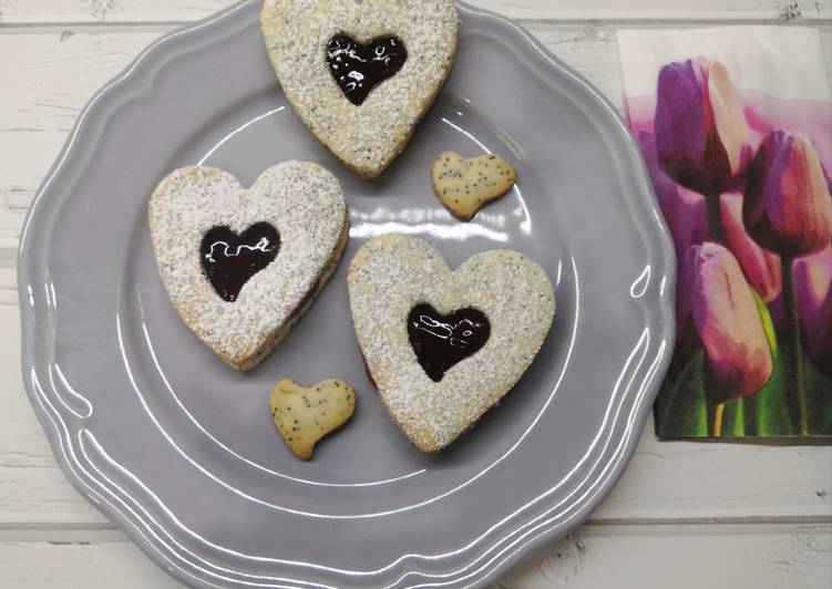 Egy sima, alap linzert feldobhatunk némi mákkal. Az apró mák szemek csodálatos külsőt varázsolnak a finom süteményünknek. Én most egyszerűen egy kissé savanykás erdei gyümölcsös lekvárral töltöttem, de tökéletes kiegészítője lehet egy savanykás, sárga, citromos krém is.