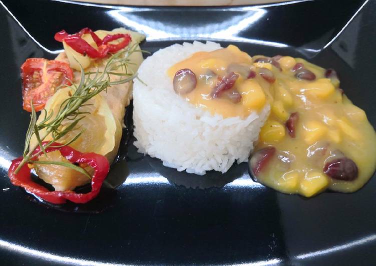 - Az étkezési keményítőt csomómentesre keverjük a vízzel, hozzáadjuk a turmixolt mangót, a fűszereket és felforraljuk.