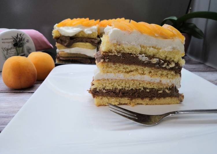 Ebben a kétfelé csokis krémben piskóta alapokra helyeztem a krémeket, amiket babapiskóta réteggel választottam el, a dísze pedig most egyszerűen sárgabarack lett. Egyéb más gyümölccsel is fantasztikus.