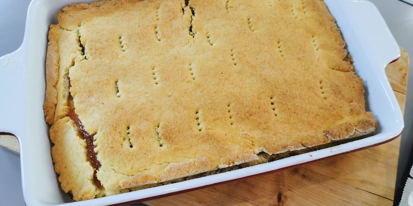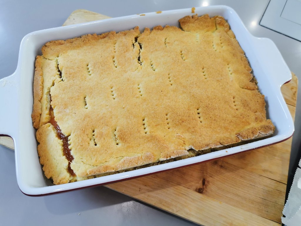 - Erre jön egy újabb tészta, lekvár, cukros dió,