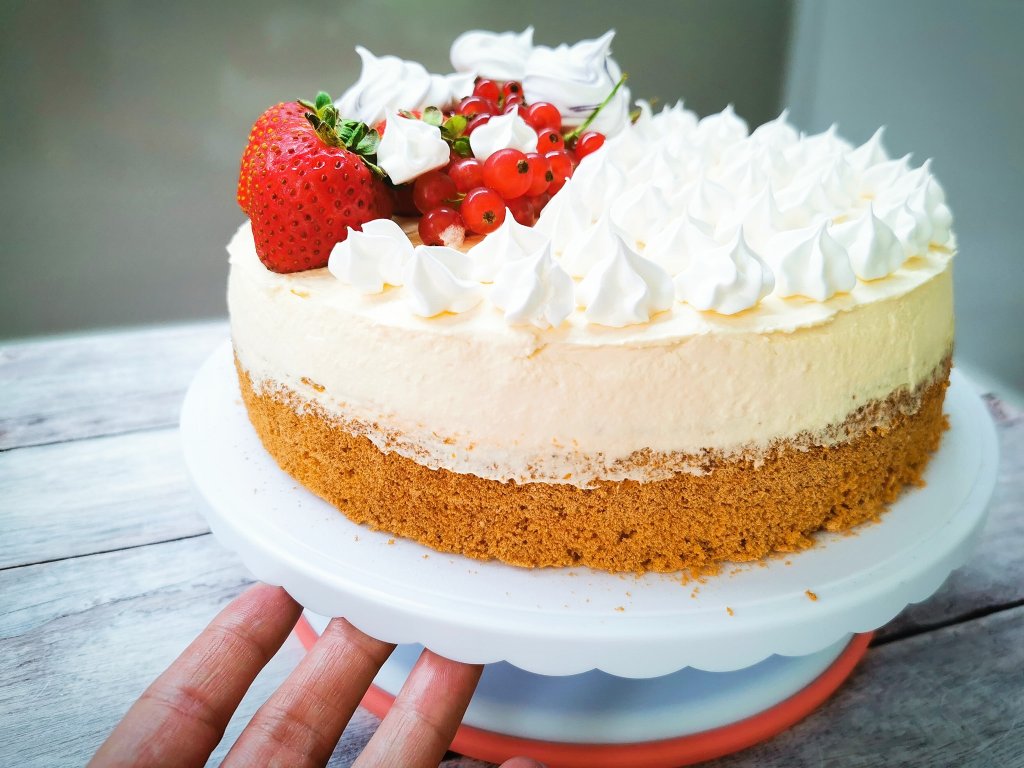 - A torta alapot kenjük meg a lekvár és víz keverékével, simítsuk rá a krémet és ízlés szerint dekorálhatjuk habcsókkal és gyümölccsel.