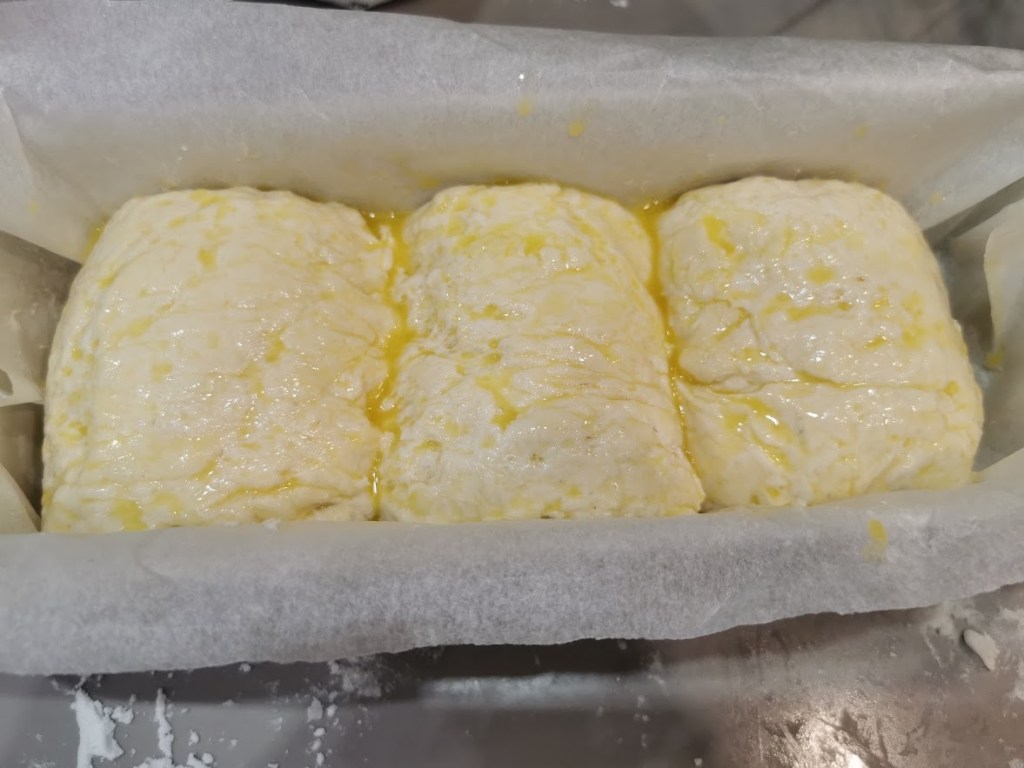 - Tegyük a 3 bucit szorosan egymás mellé egy sütőpapírral kikent kenyérsütő formába és kenjük le a tetejét olvasztott margarinnal.