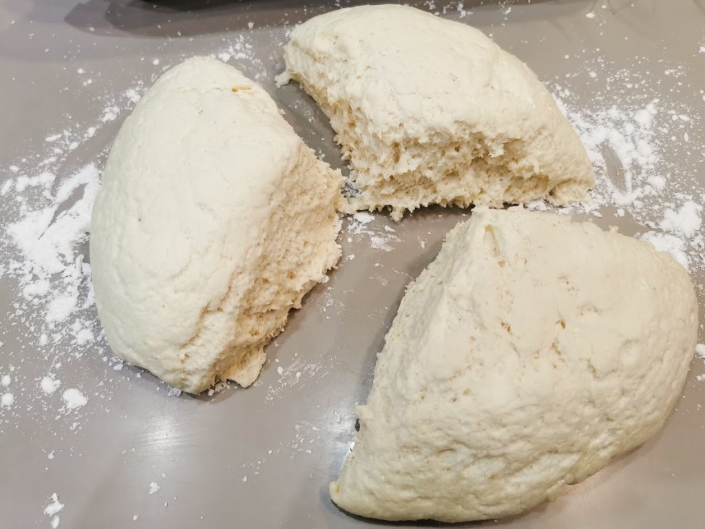 - A megkelt tésztával bánjunk nagyon óvatosan! Borítsuk ki enyhén olajos felületre és osszuk 3 egyenlő részre.
