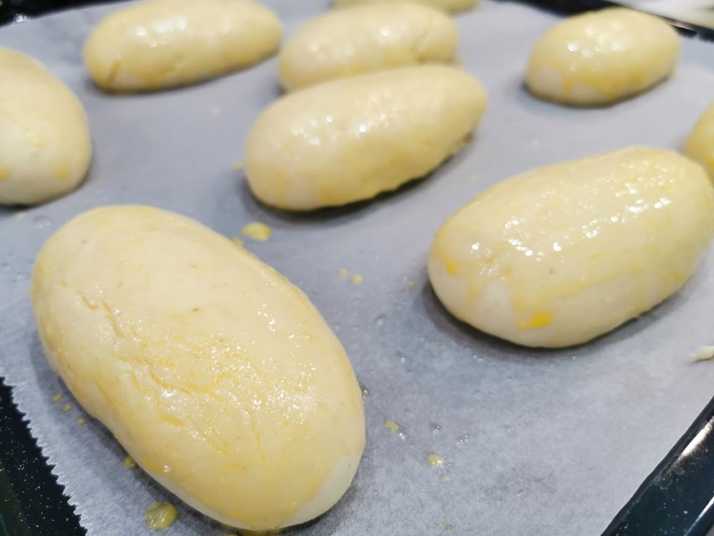 ●Vegyük ki a megkelt kifliket a sütőből, kenjük le vízzel összekevert tojással.