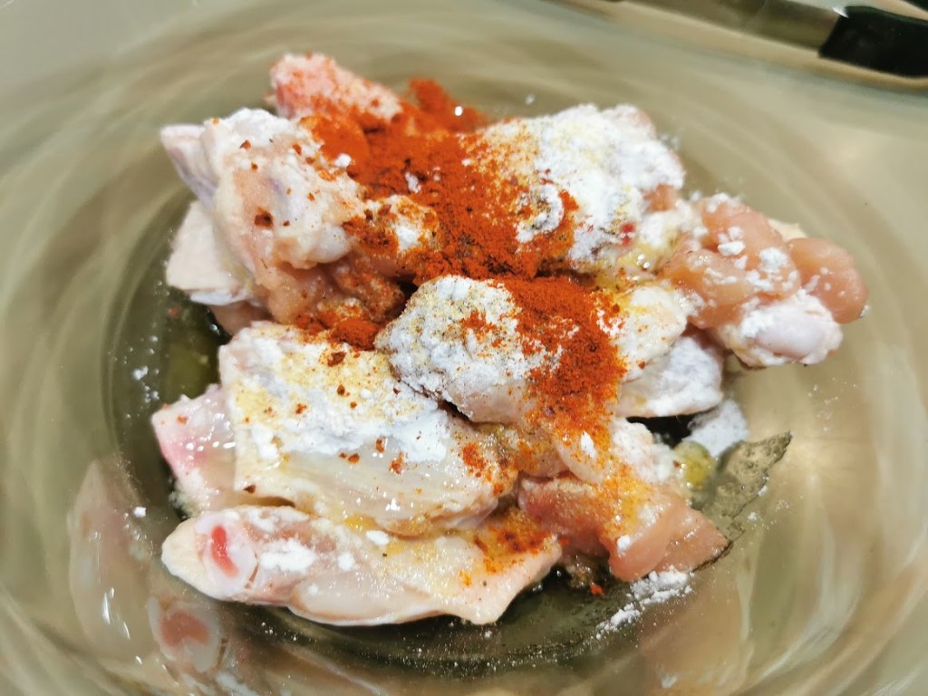●Tegyük egy tálba a száraz szárnyakat, szórjuk meg a sütőporral, a fűszerekkel, locsoljuk meg az olajjal és alaposan keverjük össze