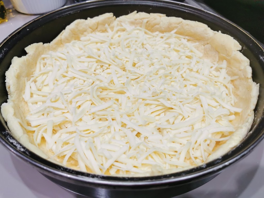 ●Tegyük a tésztát a serpenyőbe, pakoljuk meg mozzarella szeletekkel, vastagon szórjuk meg reszelt sajttal és fedjük be a paradicsomos szósszal.