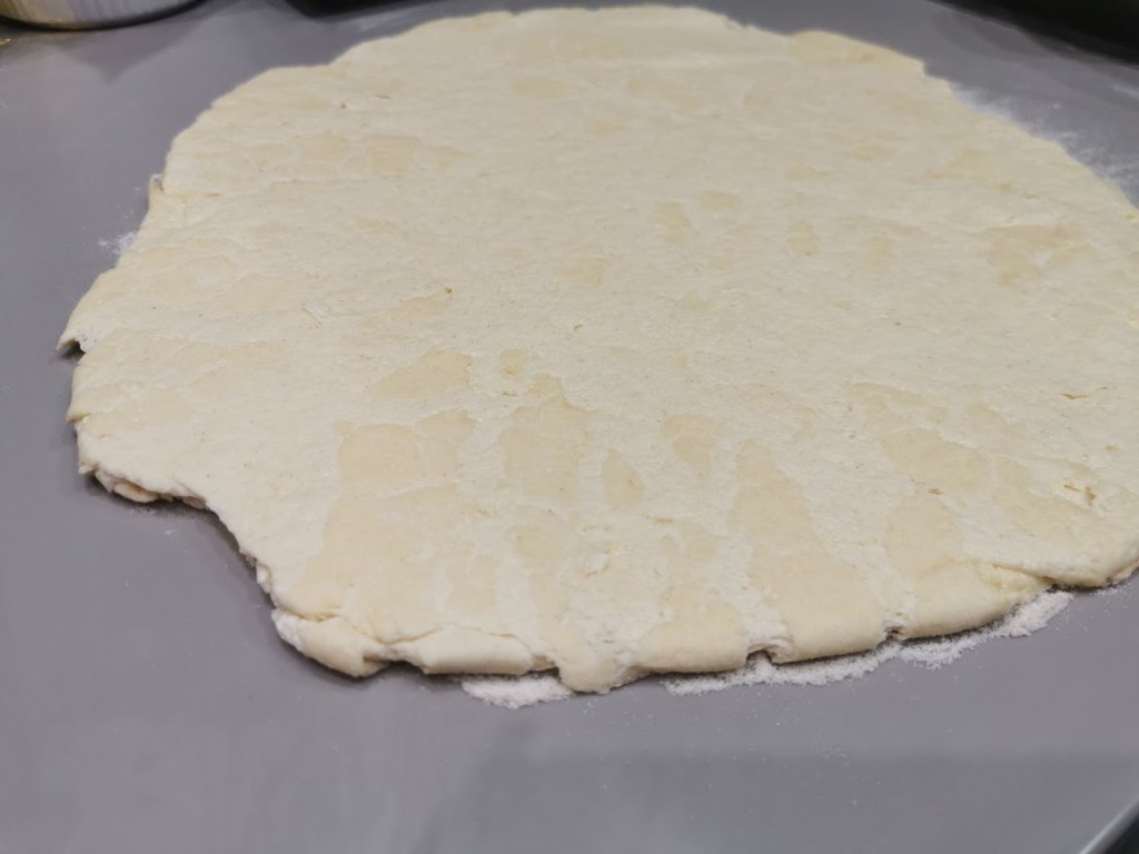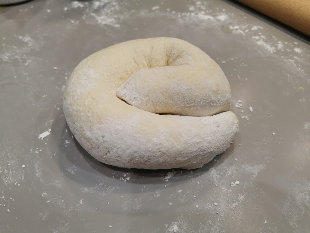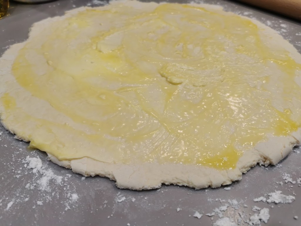 ●Nyújtsuk ki a tésztát kb 3 mm vastagra és kenjük meg nagyon puha vajjal. Tekerjük fel és óvatosan formázzunk belőle újra bucit, de igyekezzünk nem összegyúrni.