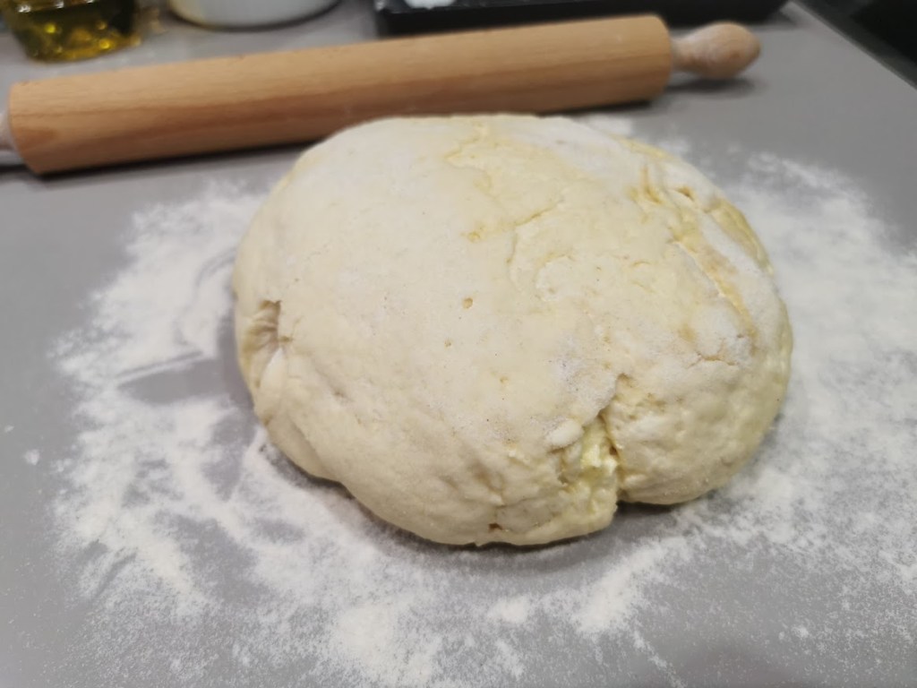 ●A tészta száraz hozzávalóit egy keverőtálban keverjük össze, adjuk hozzá a vizet, olajat és gyúrjunk egynemű, rugalmas tésztát.