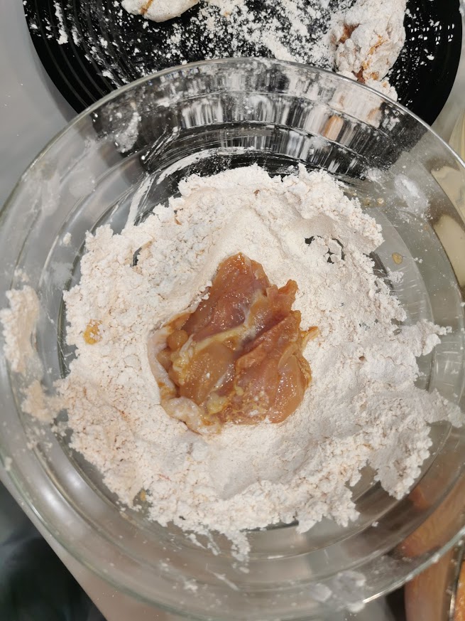 ●A húst forgassuk bele a lisztes keverékébe, majd merítsük vízbe egy pillanatra és újra forgassuk a lisztbe. A vizet érdemes egy mély tálba tenni, hogy gyorsan meg tudjuk benne meríteni.