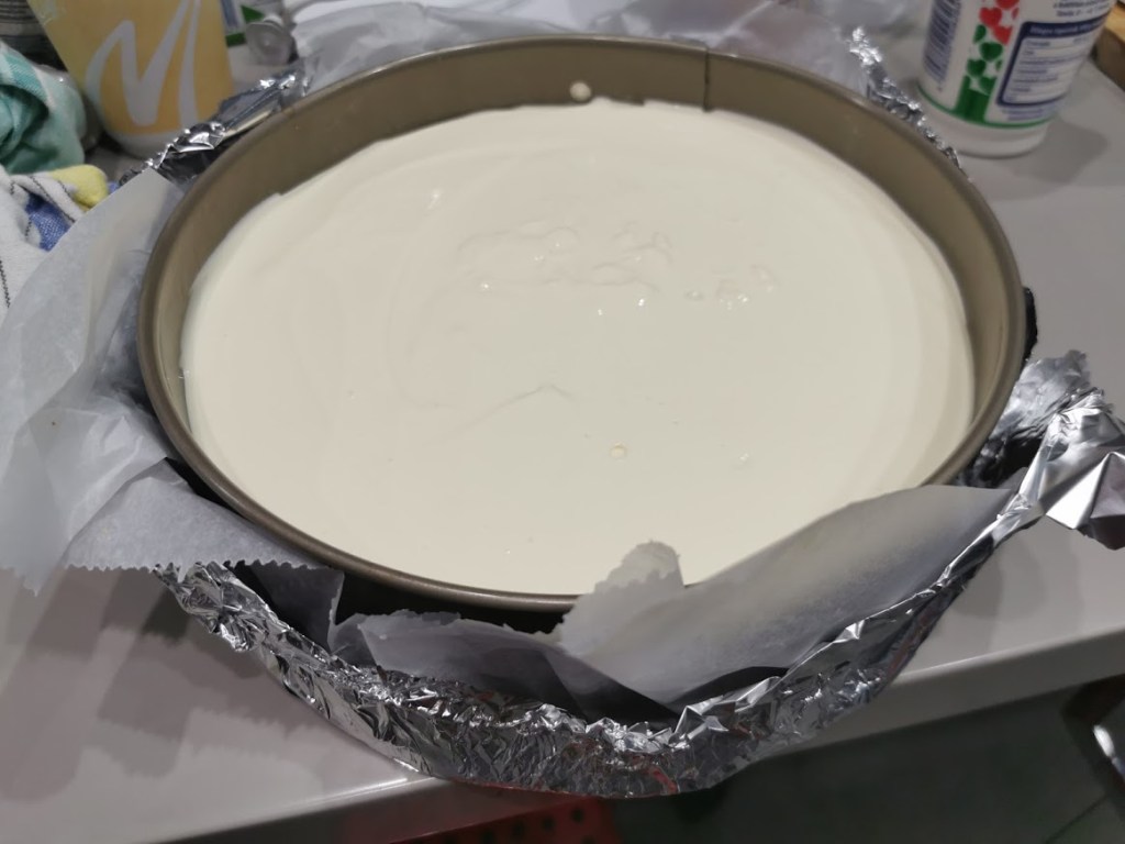 ●A tortaformát (én 24 cm-esben készítettem, de 20 cm bőven elég hozzá, akkor szép magas lesz a sajtos réteg) béleljünk ki sütőpapírral és nyomkodjuk bele a keksz alapot.