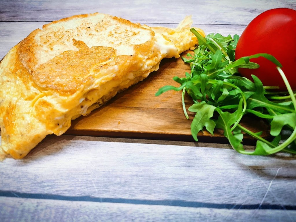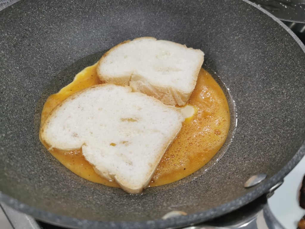 ●Egy serpenyőbe melegítsünk fel egy kevés olajat, öntsük bele a tojást, tegyünk rá 2 szelet kenyeret egymás mellé