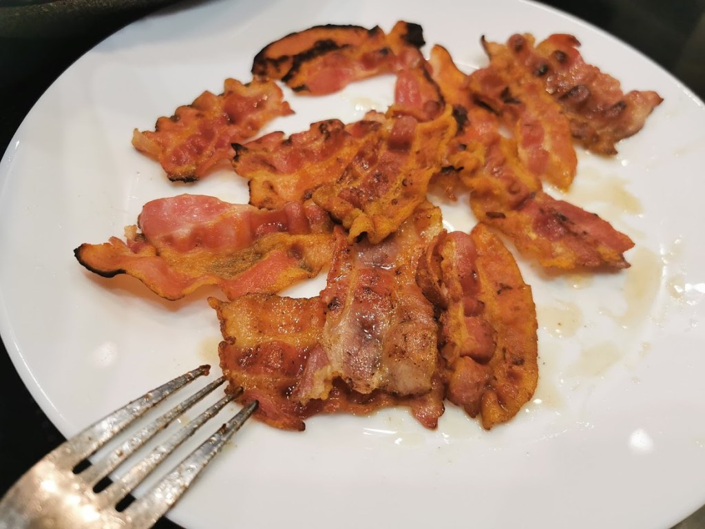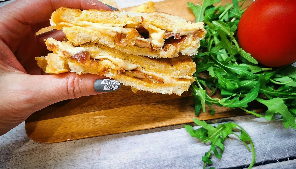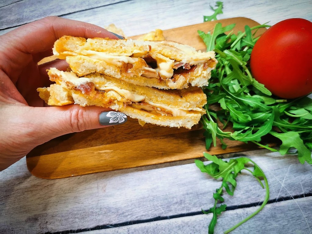 ●Tegyünk rá sajtot, bacont és hajtsuk össze. A kenyér legyen kívül
