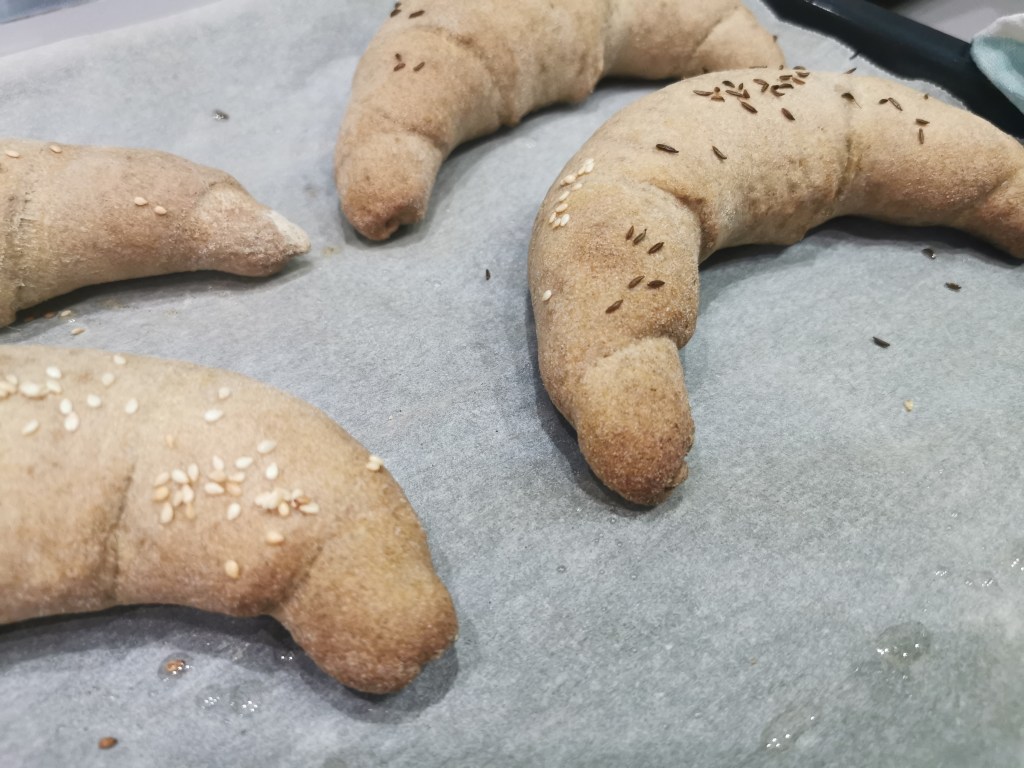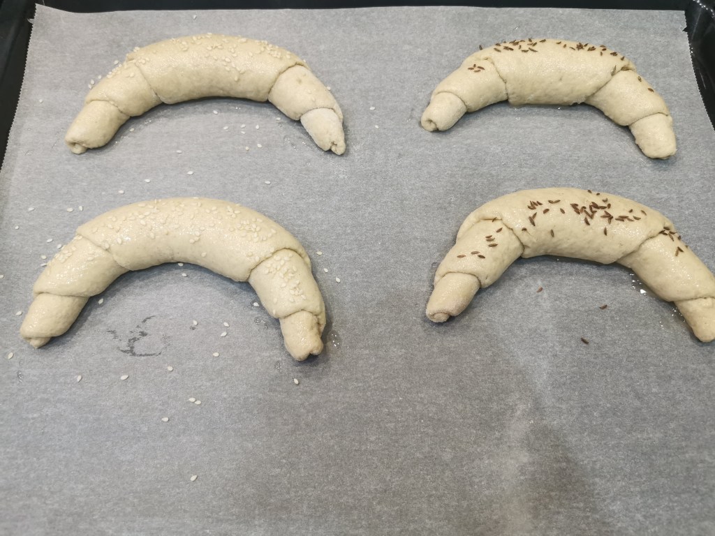 - Tegyük a kifliket sütőpapírral bélelt tepsibe, vékonyan kenjük le kókuszolajjal, ízlés szerint szórjuk meg magokkal.