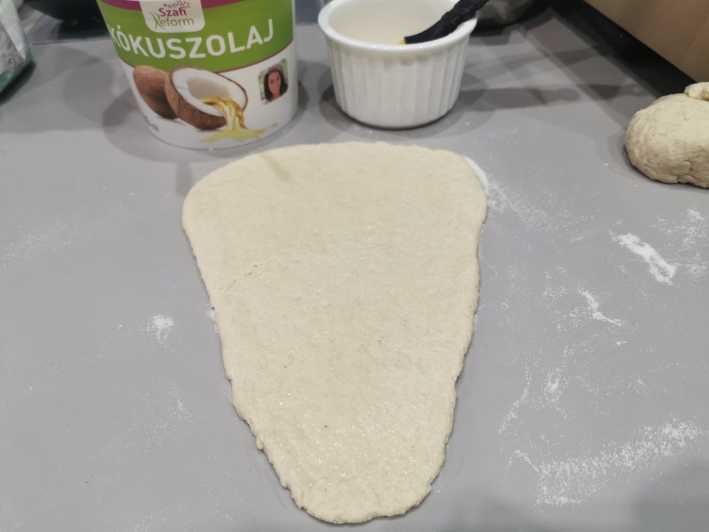 - Osszuk 4 egyenlő részre, formázzunk belőle bucikat. Enyhén lisztes felületen nyújtsuk a bucikat háromszög alakúra. Vékonyan kenjük le a tésztát kókuszolajjal, tekerjük fel és formázzunk belőle kiflit.