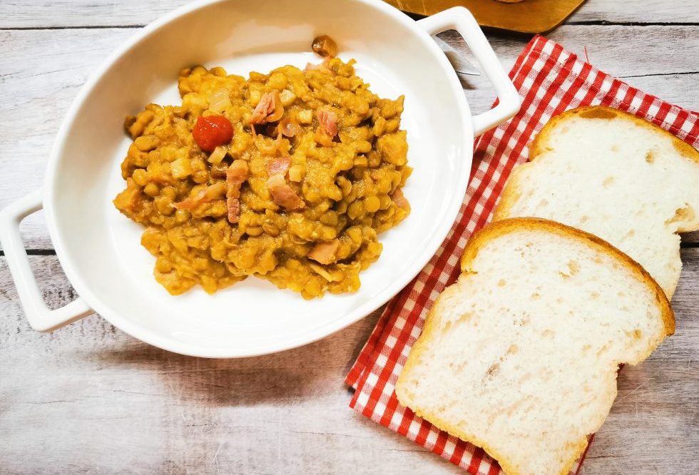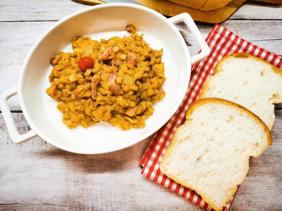 Ezt a húsos, lencsés ételt a finom, fehér száraz bor teszi igazán pikánssá, a füstölt szalonna, hús mellett. Nem is kell hozzá semmi más, csak igazi, friss, hófehér kenyér, természetesen gluténmentesen, a Pécsi Pékinastól.