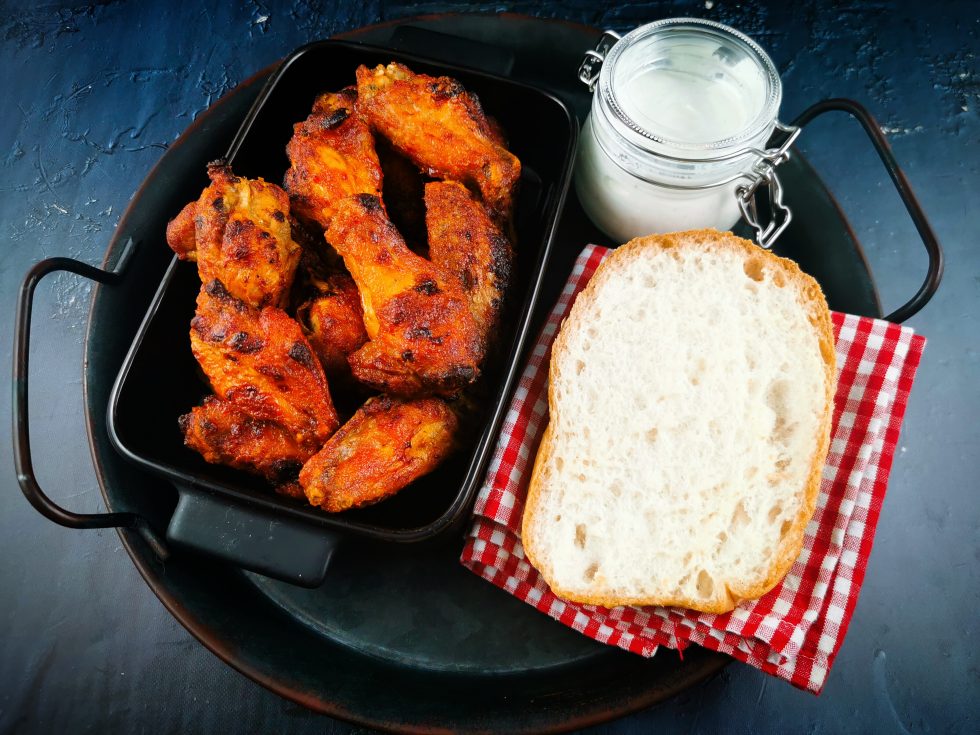 Eredetileg a buffalo chicken wings sok órán keresztül készül, ez a verzió viszont fél óra alatt már a tányérunkra is kerülhet. Aki nem rajong a paradicsomos körítésért, hagyja ki nyugodtan, és az olajból kiszedve egyből mártogassa a fokhagymás tejfölbe. Egyéb köretet én nem szoktam mellé tálalni, viszont pár szelet puha kenyér jól csúszik hozzá.