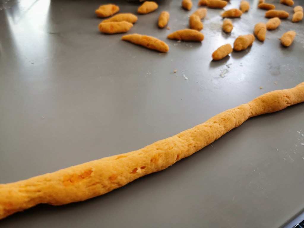 - A bucikat sodorjuk vékony rúddá és vágjuk fel kb. fél cm-es darabokra, majd a két tenyerünk között pödörgessük meg nudli alakúra.