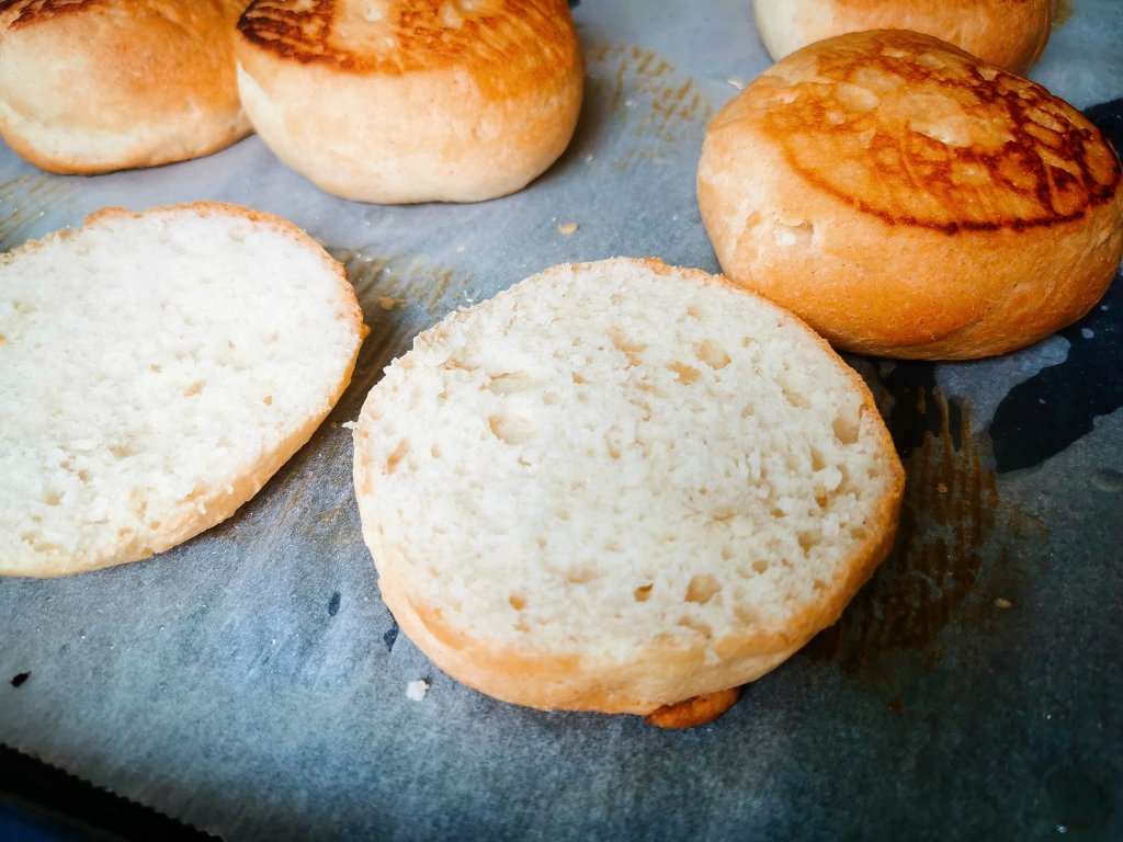 Átfutottam pár eredeti receptet, megnéztem pár videót és bevallom nem reménykedtem benne, hogy ez akkora durranás lesz. Pedig ez még annál is nagyobbat szól!!! Nem csak hangja és füstje van, hanem ez maga a nagybetűs PÉKSÜTI a szó minden értelmében. Ennyire lágy, végtermékkel még nem találkoztam a gluténmentes pályafutásom során. Lehet, hogy első nekifutásra kissé macerásnak tűnik, de megéri a meló, az tuti. A bedagasztott tészta a szokásos, kissé ragacsos, de gyönyörűen formázható, tartja az alakját. Duplán kelesztettem: egyben a tésztát, majd az apró bucikat. A második kelesztés után jön a rafkó: forró, száraz serpenyőben elő kell sütni!!! Ez pár pillanat alatt kész van, utána süthetjük is. Mivel ez igen hatalmas adag lett, így a felét elősütés nélkül sütöttem meg, ezzel abszolút kéreg nélküli, pihepuha zsemléket kaptam. Legközelebb kiflit sütök belőle