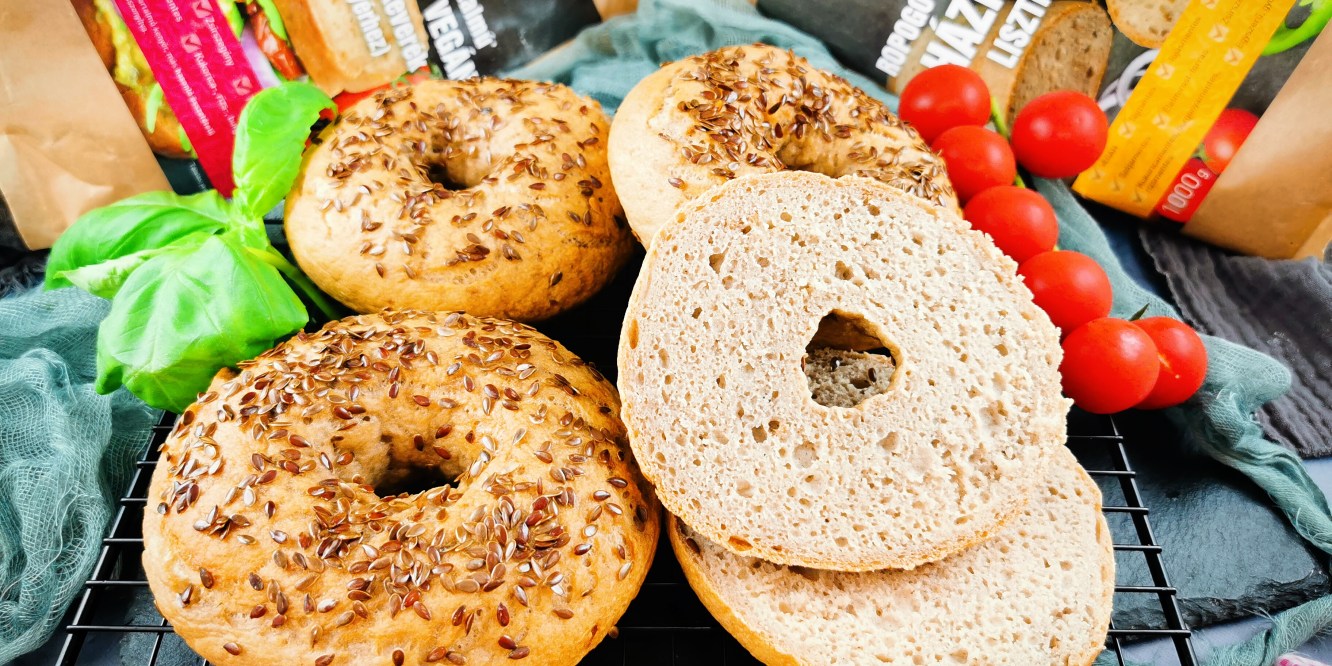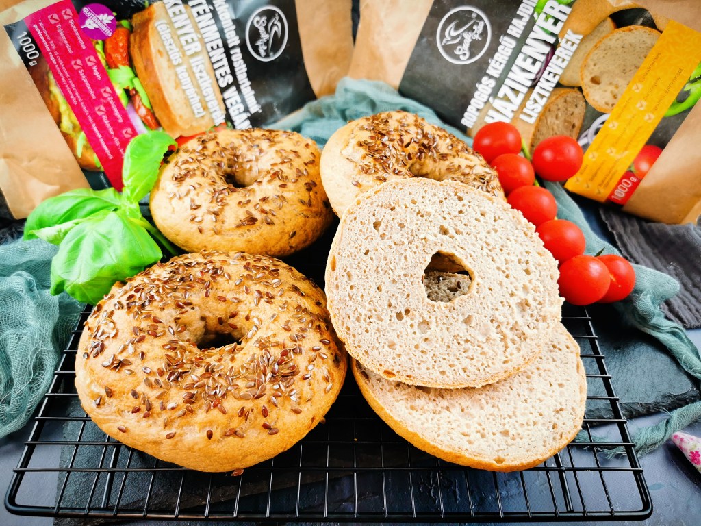 Kétféle Szafi lisztkeveréket használtam: az alapja a Szafi Free csökkentett rosttartalmú vegán kenyér lisztkeveréket és ezt egészítettem ki egy kevés Szafi Free ropogós kérgű hajdinás kenyér lisztkeverékkel. Hát igazán jól áll egymásnak és a bagelnak ez a két liszt. Nagyon könnyen formázható a nyers tészta, a végeredmény pedig egy roppanós héjú, pihe-puha belezetű péksütemény lett. Érdemes akár dupla adagot is készíteni egyszerre, mert napokig puha marad.