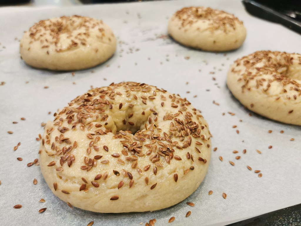 A bagel attól lesz bagel és nem zsemle, hogy kelesztés után mézes vízben előfőzzük. Én most méz helyett fiber syrupot tettem a vízbe, így semmiféle hozzáadott cukrot nem tartalmaz és vegan maradt. Az íze pedig pont olyan, mint a mézes társának.
