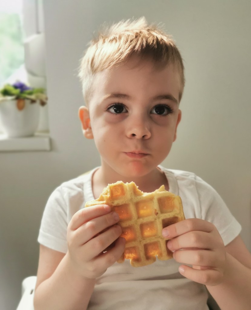 Soma fiam alig győzte kivárni, hogy megsüljön a gofri, majd ehető hőmérsékletűre hűljön. Gyorsan a kezébe vette, beleharapott és közölte: „anya, ez elég jó!” és megevett gyorsan két darabot.