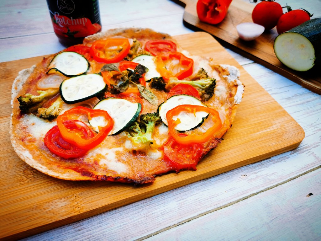 Mivel nekem nem volt időm a tészta kelesztésére, ezért egyszerűen kihagytam az élesztőt, a tészta így is tökéltes lett. Amolyan igai, ropogós, vékony tésztás pizza sült ki belőle, ráadásul a sütőt sem kellett bekapcsolni hozzá. A pizza feltét tetszőleges módon variálható, én most csak növényi sajtot és zöldségeket tettem rá, és megkentem egy kevés Szafi ketchuppel.