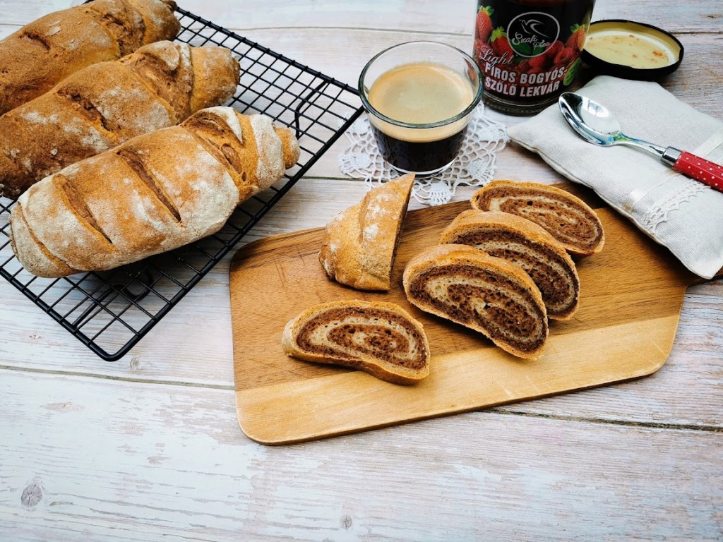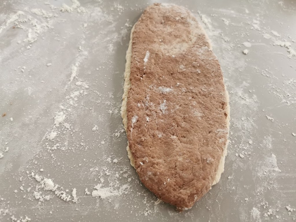 - Osszuk a fehér és a barna tésztát 4 egyenlő részre. Liszttel megszórt felületen nyújtsunk ki kissé ovális alakúra 1-1 fehér és barna tésztát, majd tegyük a barnát a fehérre és szorosan tekerjük fel.