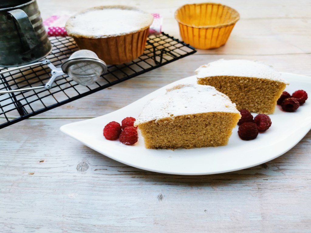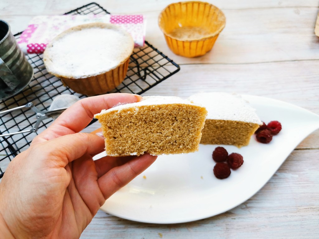 A hosszú bevezető után térjünk a tárgyra, vagyis a mikrós sütire. A zacsi, ami előkerült a szekrényből, egy Szafi Free karamell ízű zabpuding por volt. A végeredmény pedig egy eszméletlen puha, durván karamell ízű piskóta lett. Annyira gyönyörű, tökéletes a tésztája, hogy simán készíthetünk belőle mini tortát is. Sára 2 db, kb. 9 cm átmérőjű, kemény papíros muffin formában sütötte mikróban, 900 W-on 3,5 percig.