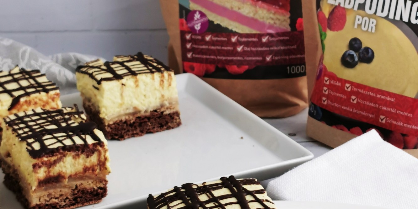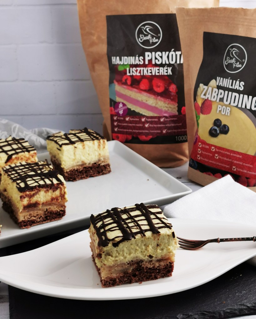 A kevert alapot Szafi Free hajdinás piskóta lisztkeverékkel sütöttem, a vaníliás réteg pedig Szafi Free vaníliás zabpudinggal készült. Az alapja tök jó puha, az almás réteg pedig ugazán szaftossá varázsolja.