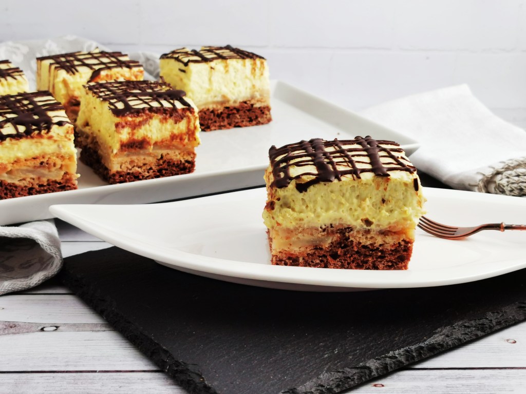 A vékony szeletekre vágott almára öntjük a piskóta alap felét, majd a másik felébe keverünk egy kevés kakaót, így tulajdonképpen már három réteg kerül a tepsibe. Amikor megsül, megfordítjuk és felülre kerül az alma, amit jó vastagon megkenünk főzött krémmel. Akkor a legfinomabb, ha alaposan lehűl és jól összeérnek az ízek.