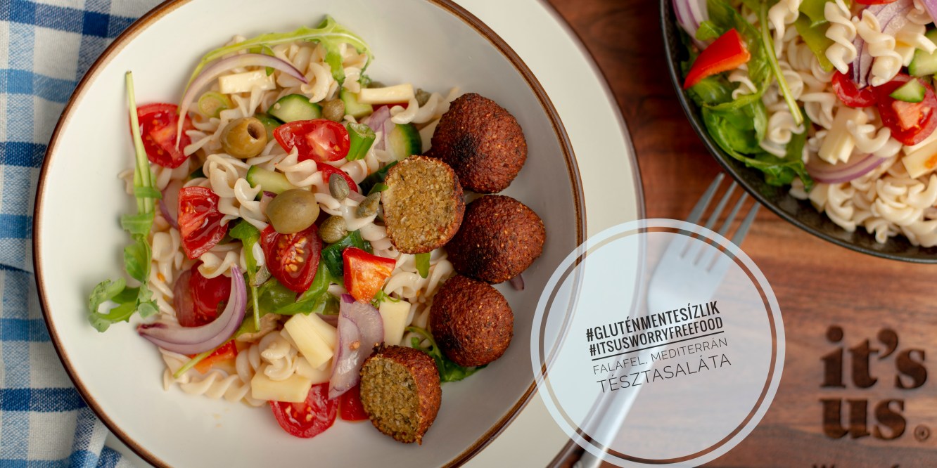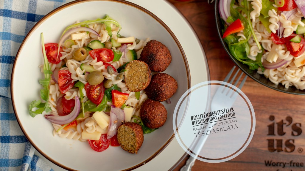 Ha roppant gyorsan szeretnénk ebédet, vacsorát készíteni, akkor ez a tésztasaláta falafel golyókkal nagyon jó választás. A tésztasalátához az It’s us Kitti’s rizs-köles tésztát választottam, ennek a semleges íze tökéltesen passzol a sok zöldséghez és a fűszeres falafel golyókhoz.
