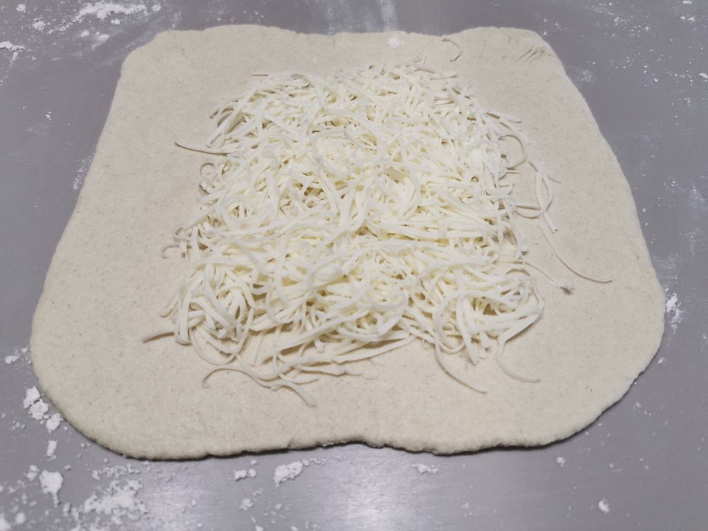 - A tésztákat nyújtsuk kb. 10×15 cm-es téglalappá, szórjunk rá reszelt sajtot és tekerjük fel.
