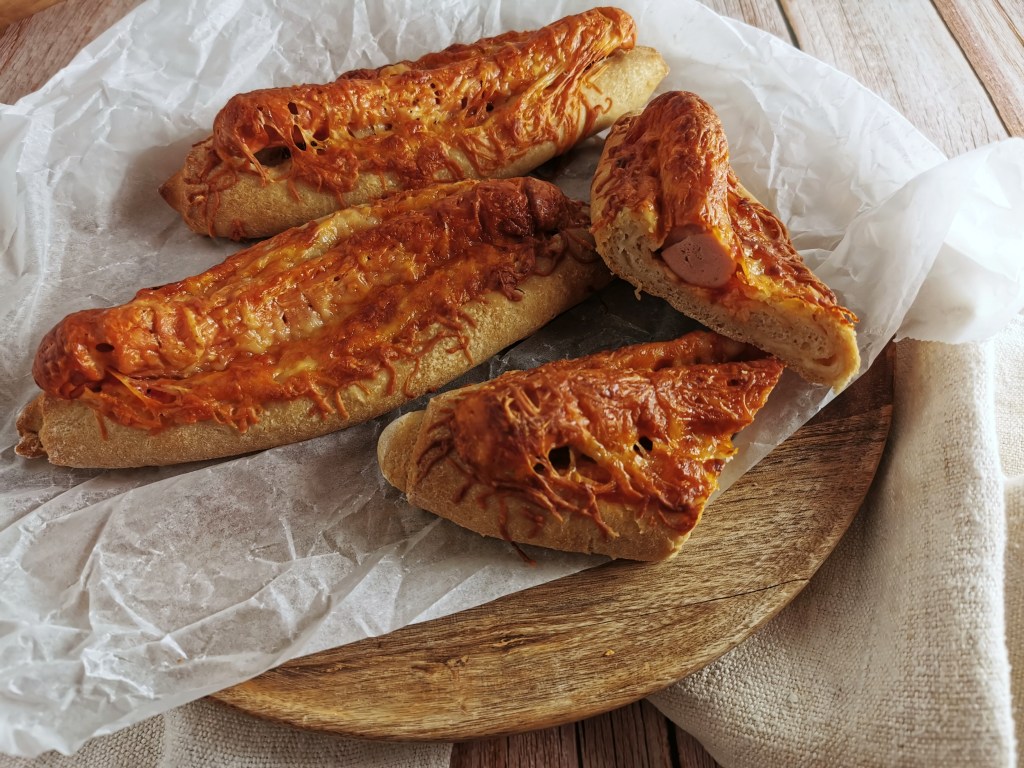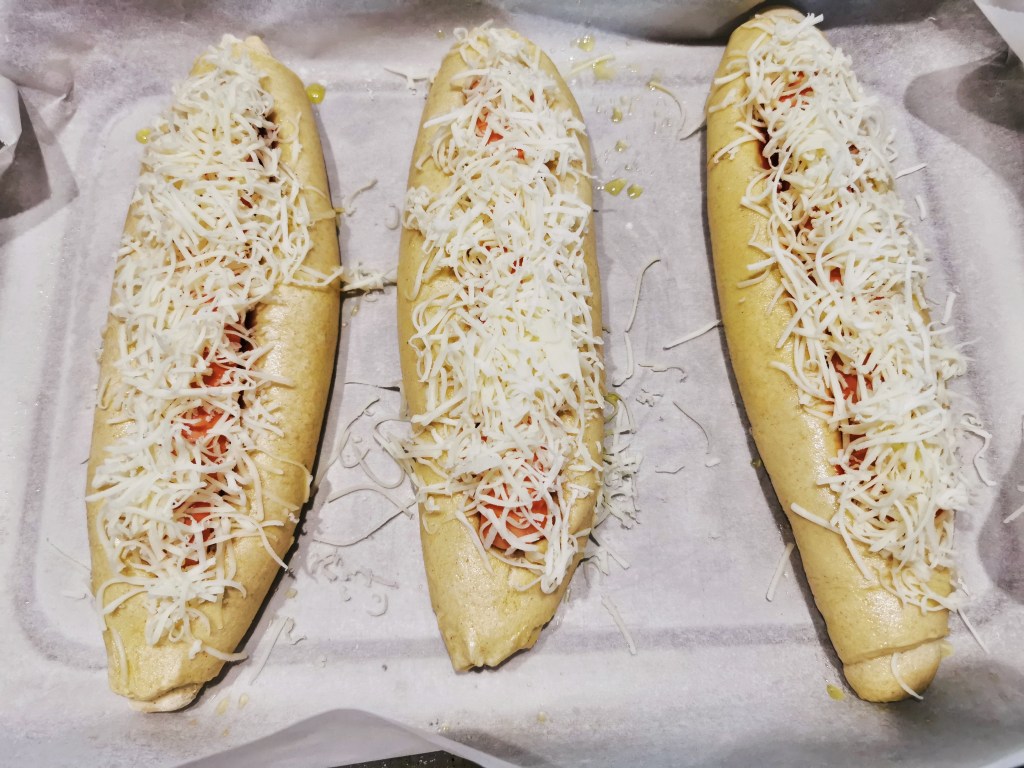 - Tegyük a közepükbe a virslit, szórjuk meg reszelt sajttal.